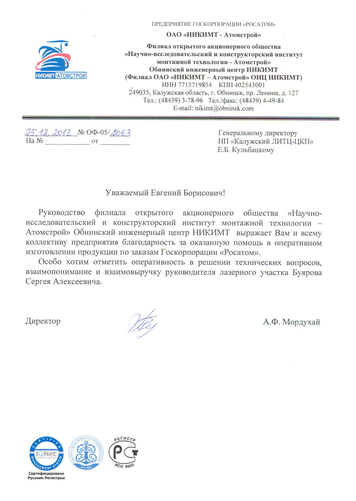 Руководство филиала ОАО «Научно-исследовательский и конструкторский институт монтажной технологии - Атомстрой» Обнинский инженерный центр НИКИМТ выразило благодарность коллективу лазерного центра за оперативную помощь в изготовлении продукции по заказам Госкорпорации «Росатом».